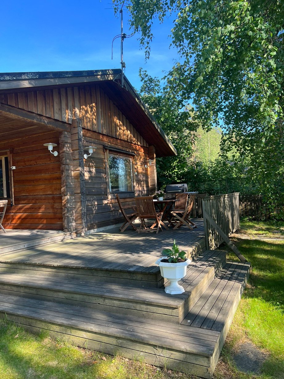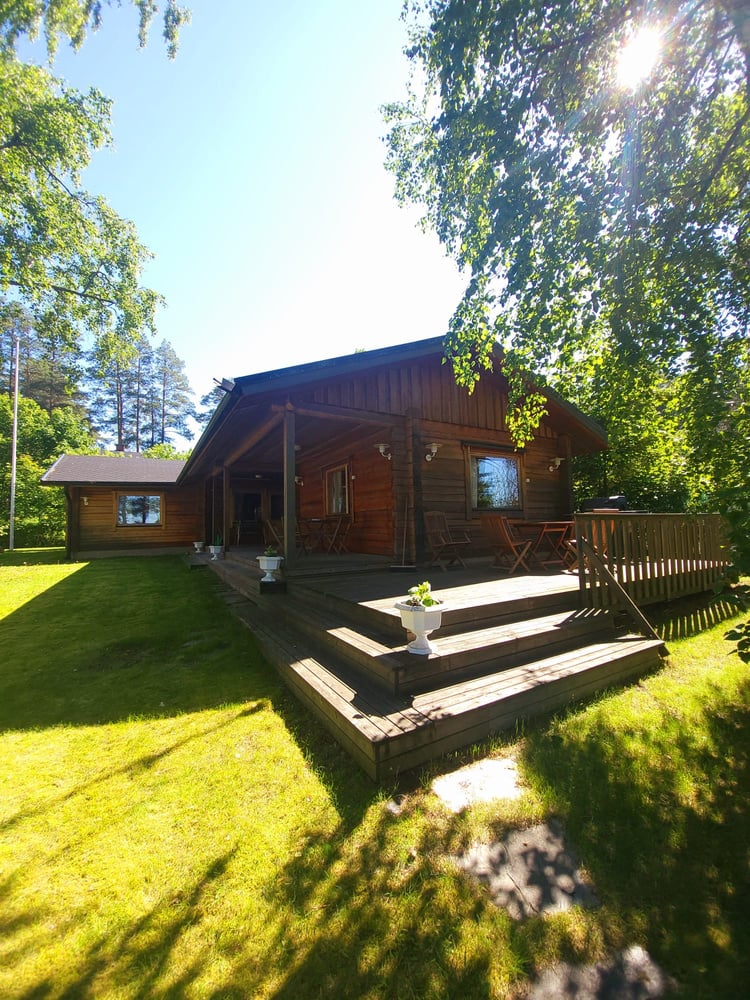 Kesäranta on paikallisen hirrenveistäjän kädenjälkeä ja sisältää kaikki lomailuun vaadittavat mukavuudet.
